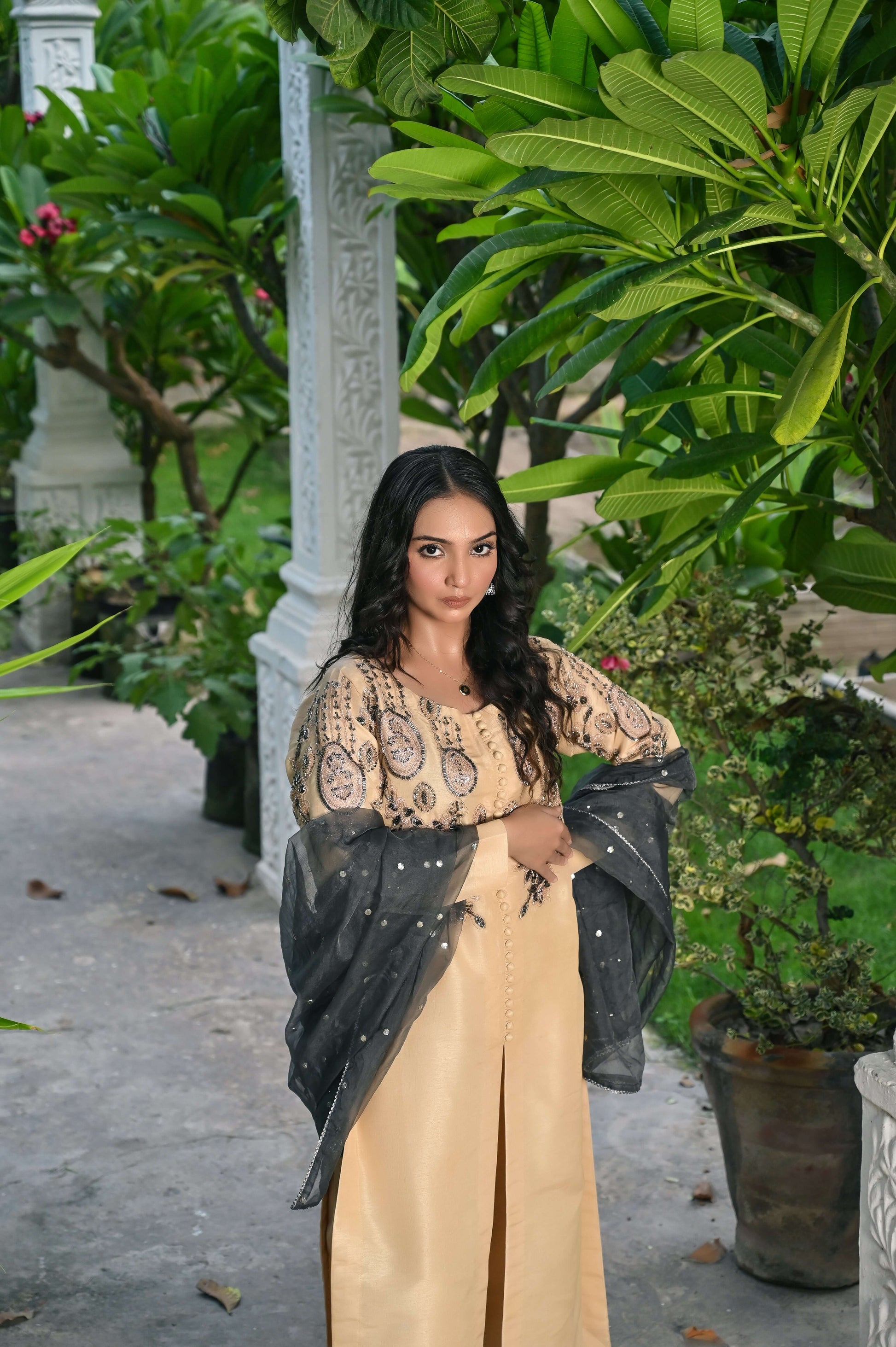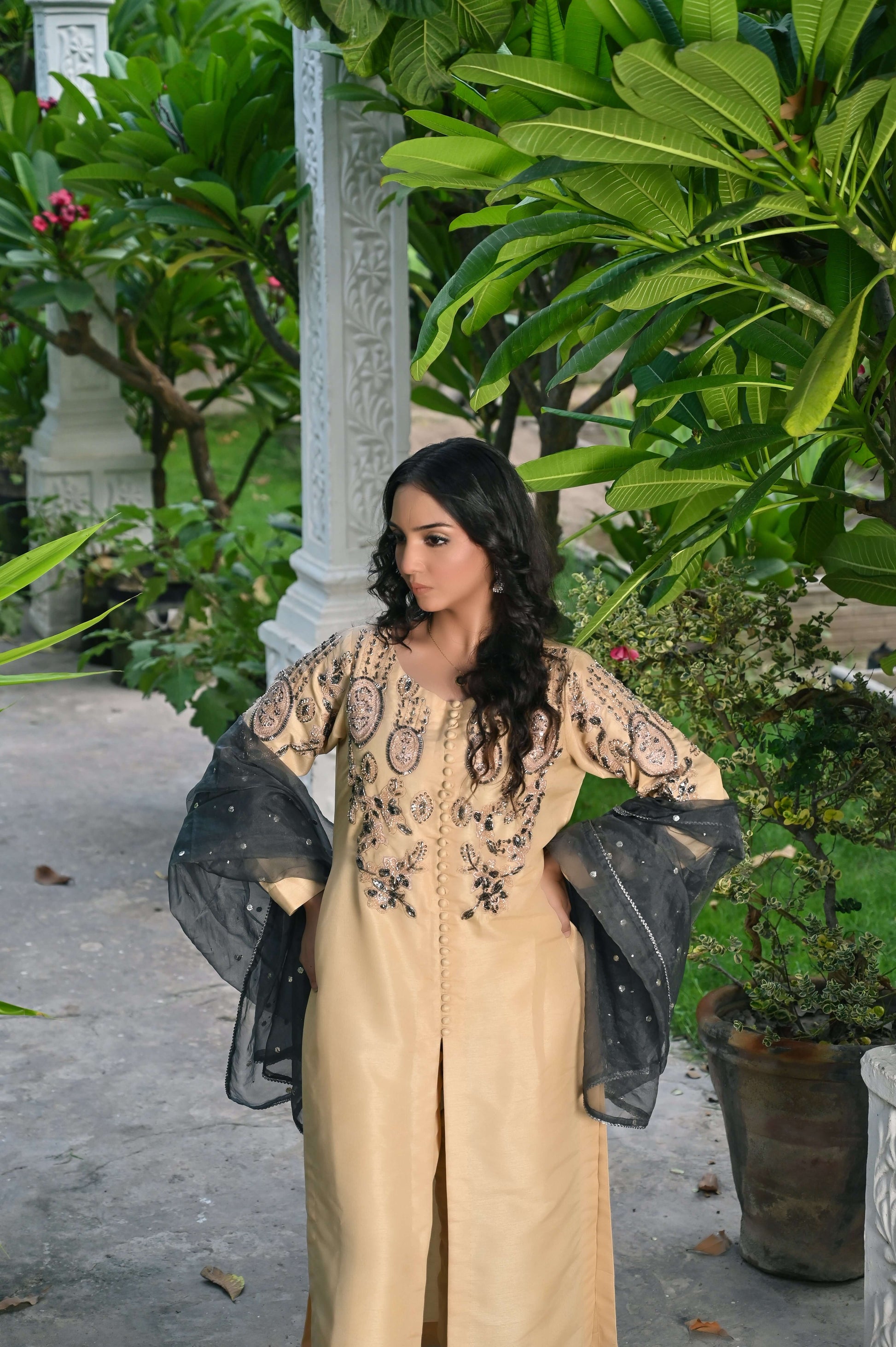 Dupatta: Delicate Organza Dupatta featuring graceful embroidered accents, adding a soft, luxurious flair to the complete look.