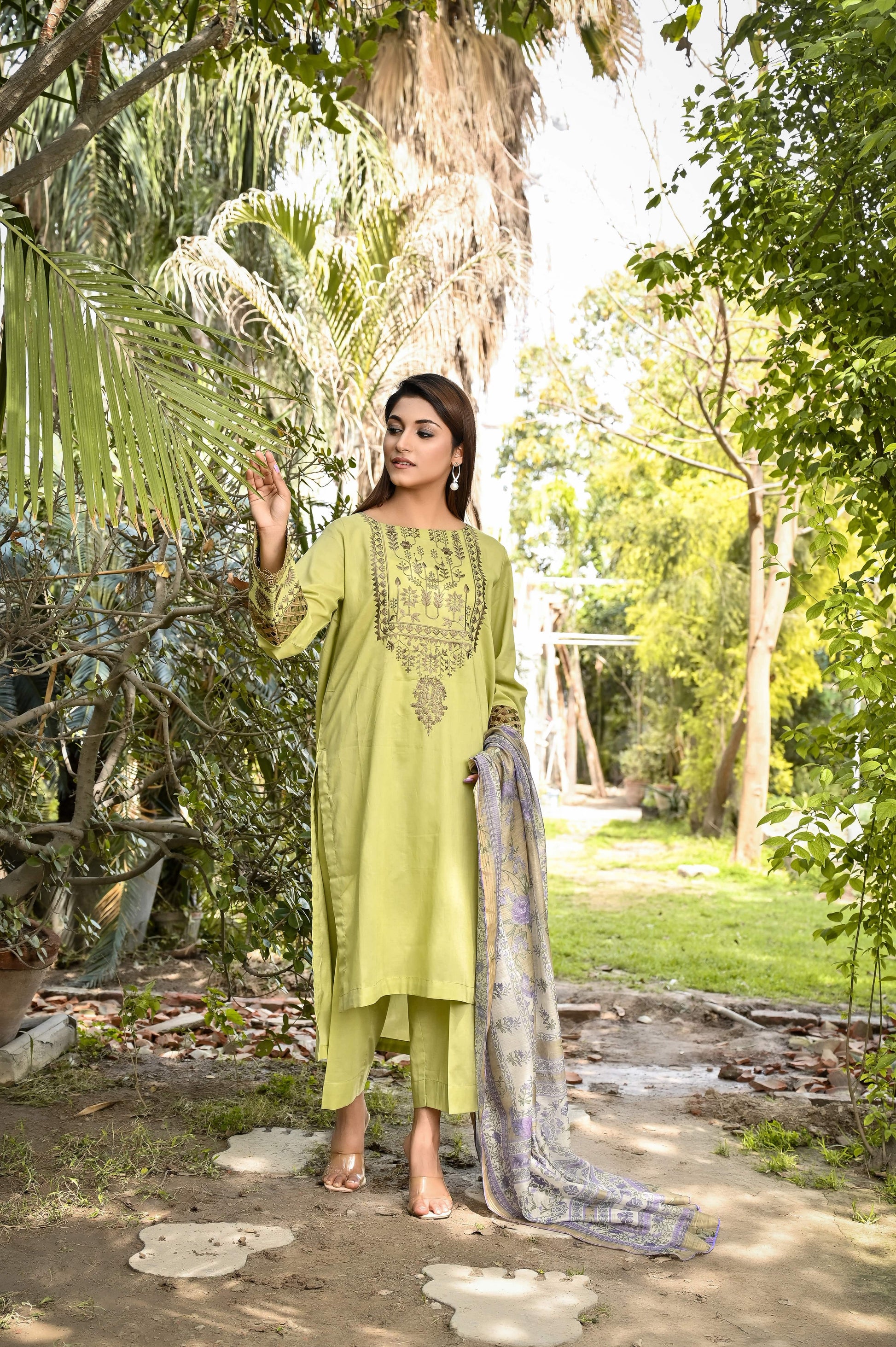 Bring freshness to your wardrobe with the 3pcs Green Embroidered Suit by Perfect Stitches by Maryam.