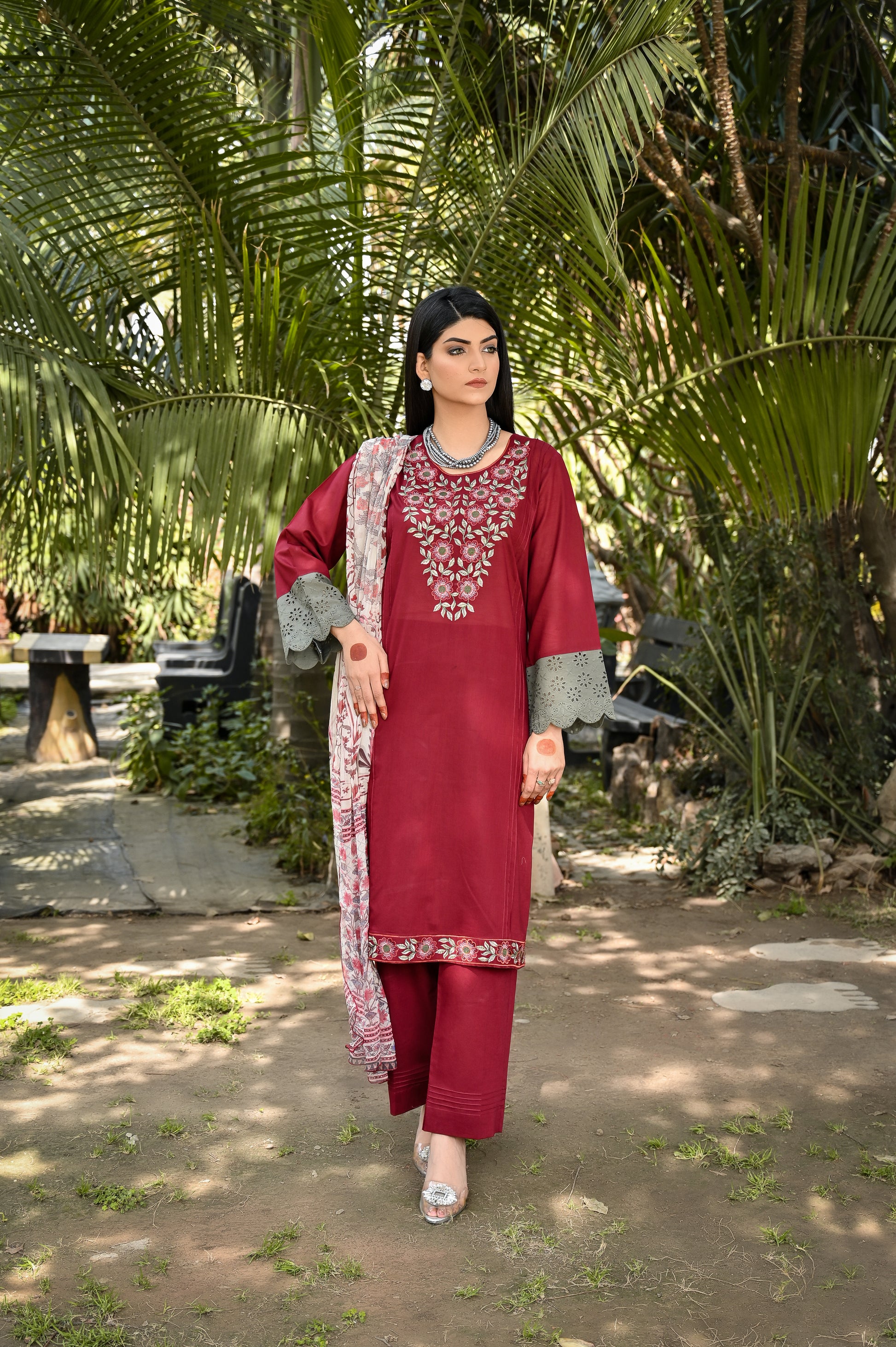 3Pcs Mhroon Embroidred - Perfect Stitches By Maryam