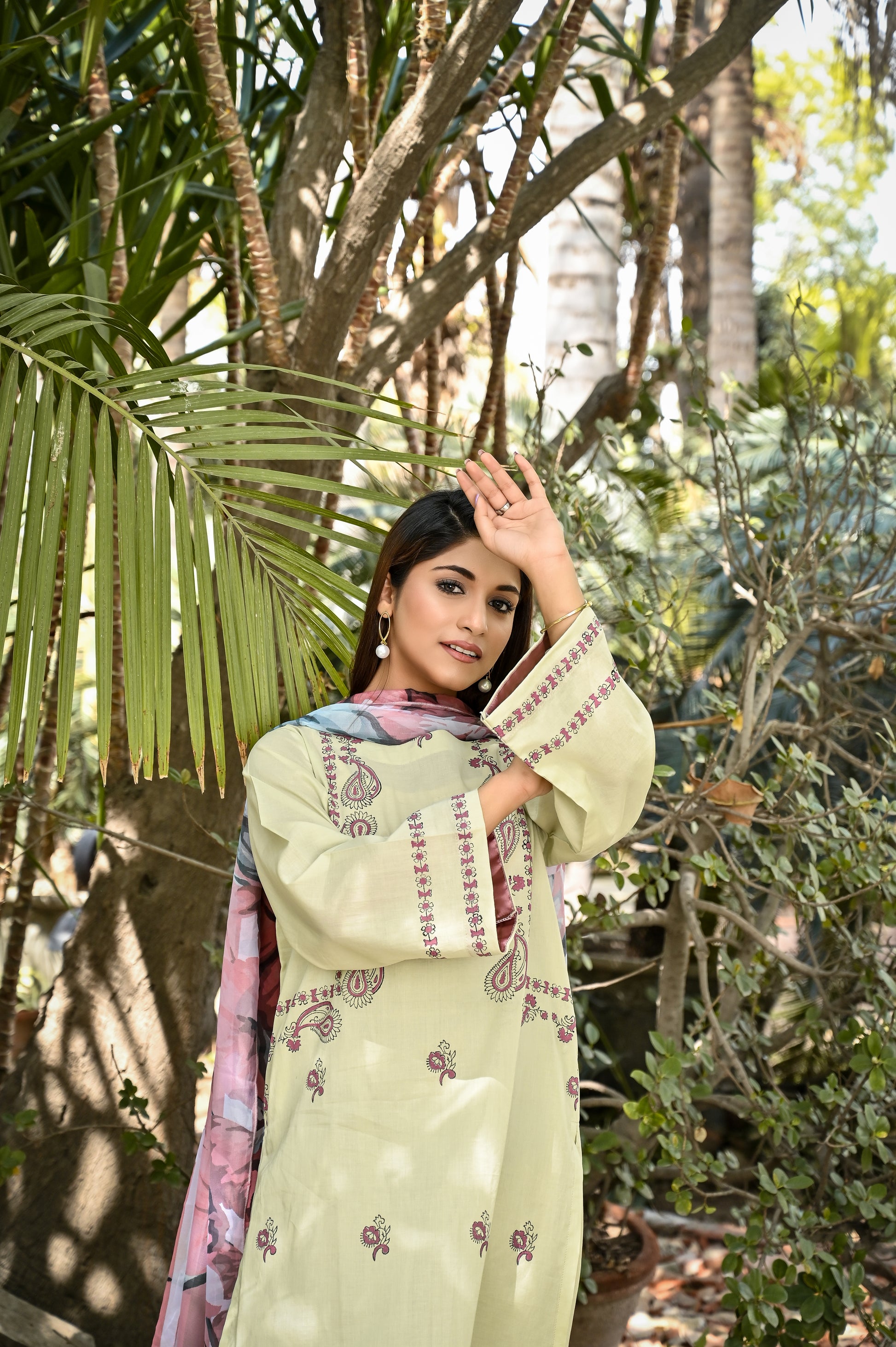 Elevate your wardrobe with this 3-piece Mint Green Block Printed Lawn Suit by Perfect Stitches By Maryam. Featuring intricate block prints on premium lawn fabric, it’s paired with a plain trouser and a beautifully printed dupatta – a perfect blend of grace and comfort.