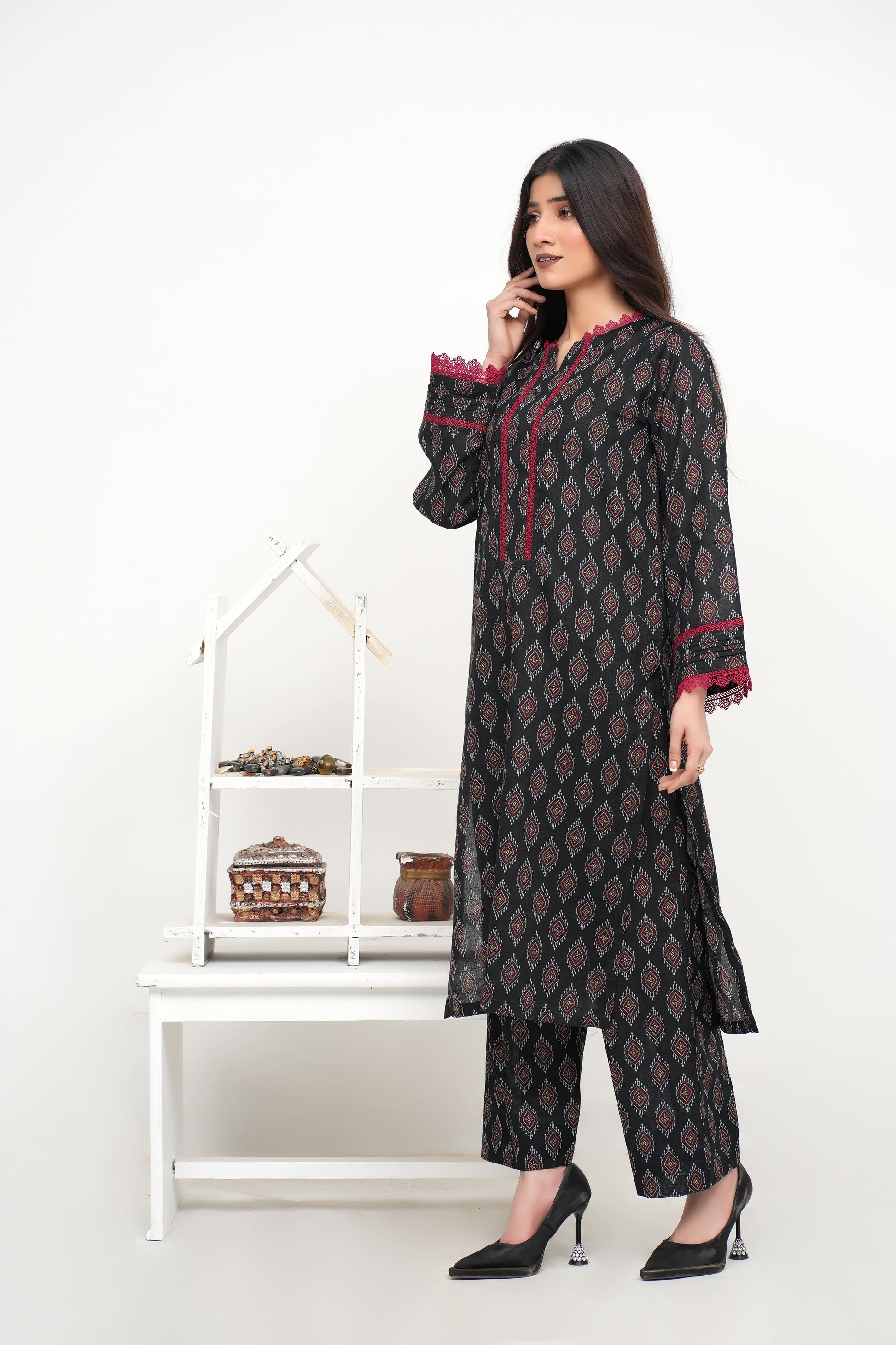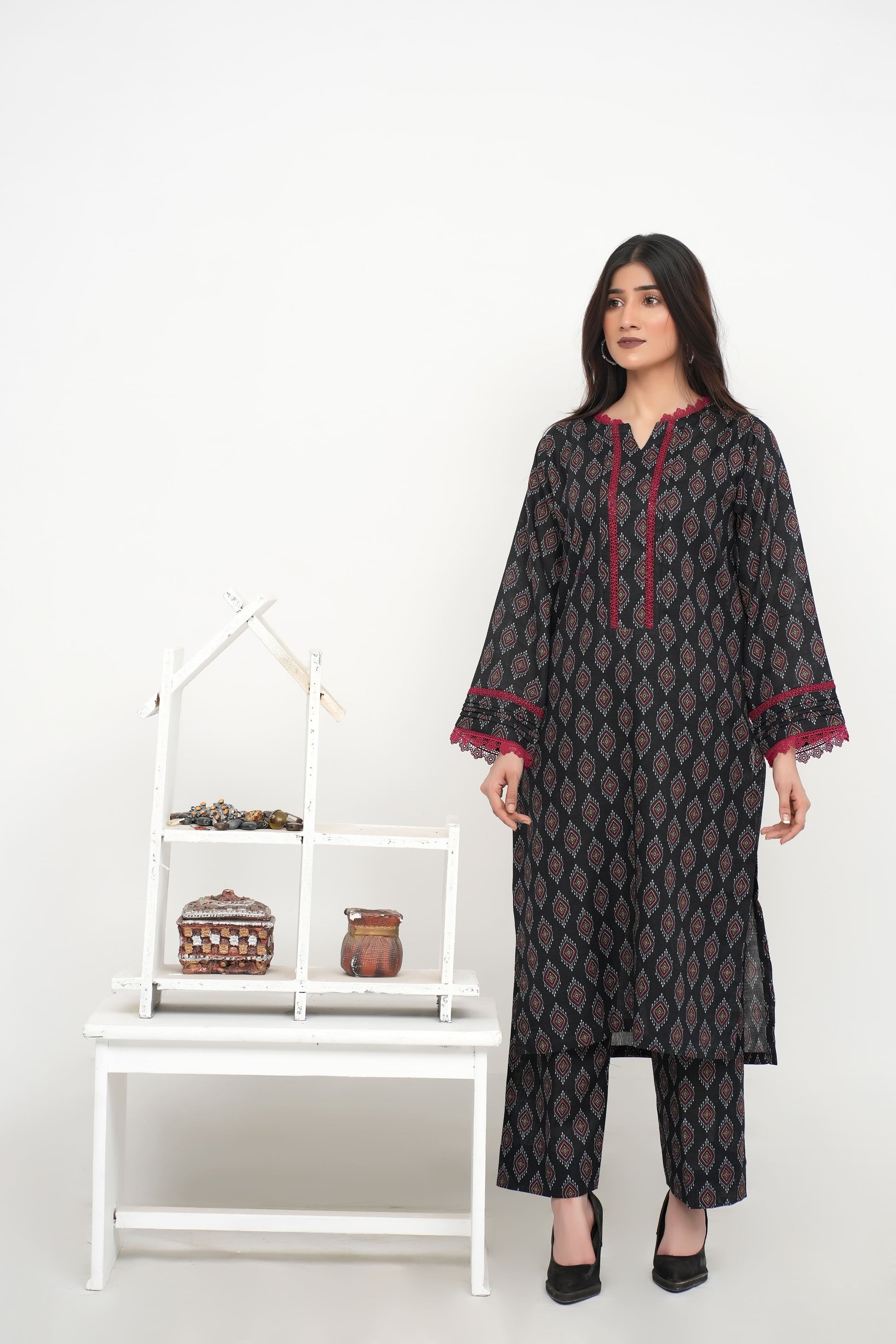 Elevate your winter style with this elegant 2-piece stitched khaddar suit in classic black. Designed with a modern printed pattern, this outfit combines comfort and sophistication, making it perfect for casual wear, office days, or small gatherings.