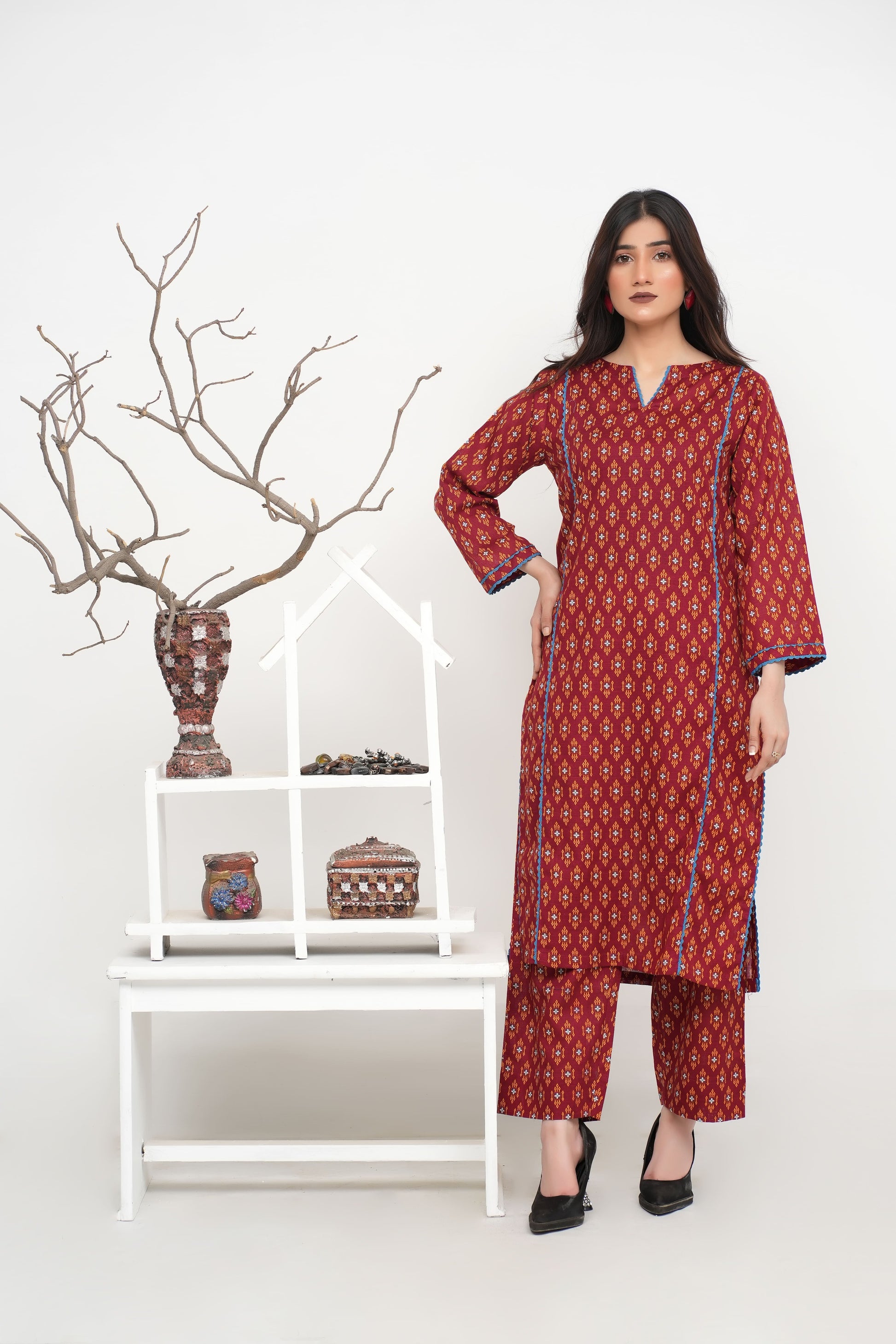 Turn heads this season with the red printed khaddar 2-piece stitched suit. Its vibrant red shade and elegant printed design bring together warmth, style, and sophistication — making it an excellent choice for casual outings, office wear, or festive gatherings.